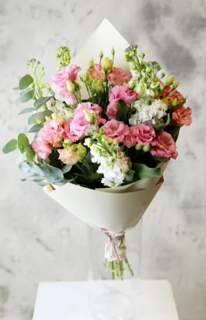 Ši kompozicija pasižymi subtiliomis pastelinių tonų gėlėmis, kurių švelnūs žiedlapiai skleidžia romantiką ir jaukumą. Jų grožį papildo eukaliptas, suteikdamas kompozicijai lengvumo ir natūralumo. Žydinčios eustomos bei leukonijos ne tik praturtina spalvinę paletę, bet ir skleidžia gaivų, atpalaiduojantį aromatą, kuris ramina ir sukuria jaukią atmosferą.