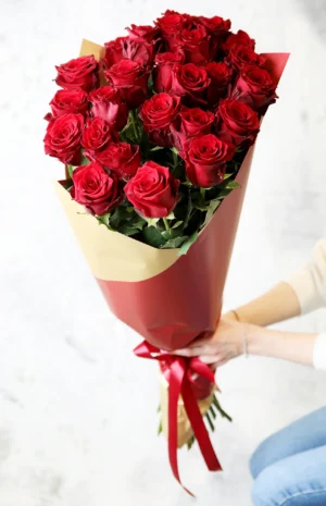 Raudonos rožės – nesenstanti meilės, aistros ir pagarbos išraiška. Ši prabangi puokštė spinduliuoja elegancija ir galingomis emocijomis, todėl yra tobula dovana ypatingai progai. Sodraus raudonio žiedai, supakuoti į rafinuotą popierių ir papuošti kaspinu, sukuria įspūdingą vaizdą.