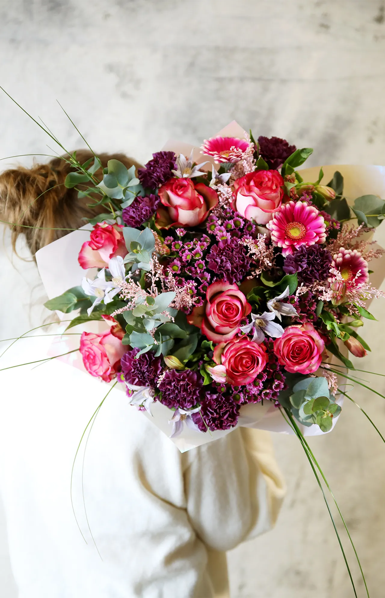 Šios puokštės pagrindą sudaro švelnių atspalvių rožės, kurios simbolizuoja gilų jausmą ir pagarbą. Jas papildo gerberos, suteikiančios puokštei tūrio ir elegantiško purumo. Tamsesnių spalvų gvazdikai įneša mistiškumo ir paslaptingumo akcentą, o alstromerijos bei eukalipto lapai suteikia žaismingumo bei gaivumo įspūdį.
